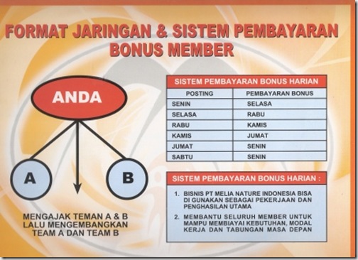 Membeli Satu Paket Usaha dan biaya Pendaftaran kemudian mengajak dan membina 2 Team, berpeluang mendapatkan Bonus-Bonus yang ditetapkan (lihat tabel diatas)